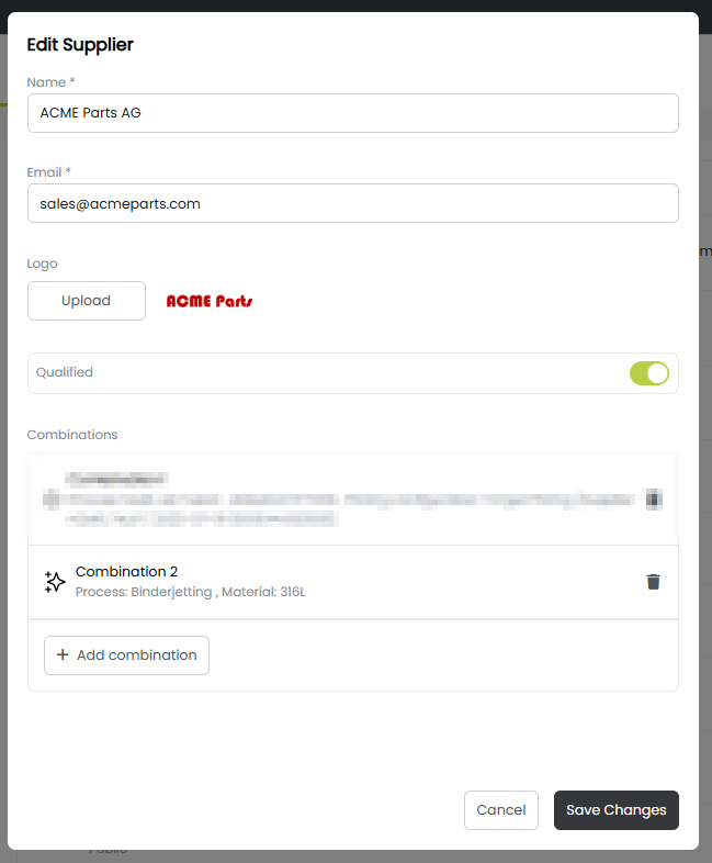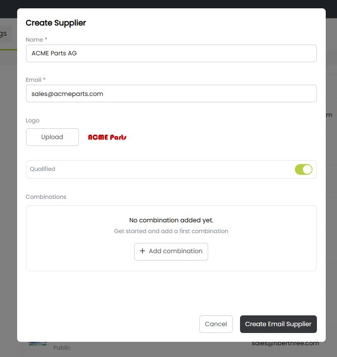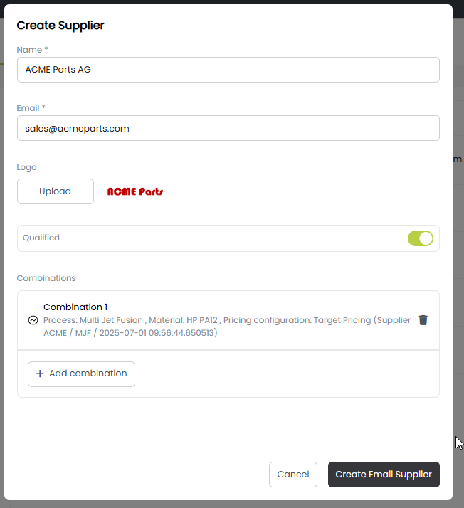 • Enter or edit the supplier’s name, email, and optional logo. If applicable, mark the supplier as Qualified.