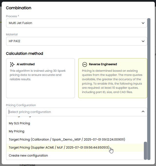 • Select the closest technology and material, choose Reverse Engineered, then select the Pricing Configuration you created in Step 1.