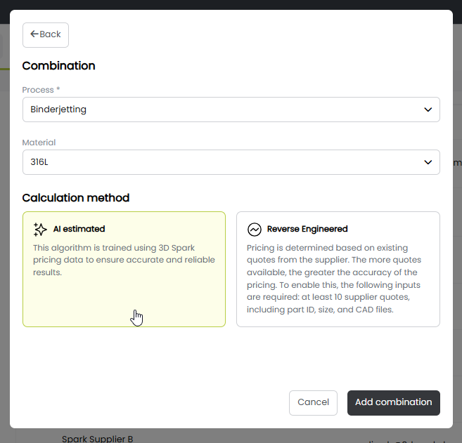 3. AI-modeled suppliers: The buyer organization adds suppliers without prior knowledge of their pricing model. 3D Spark’s AI then calculates indicative prices for orders.