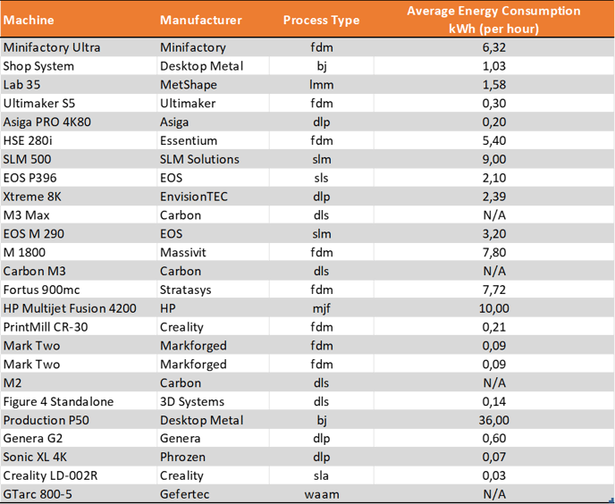 [Pmachine]: Average energy consumption of the 3D printer per hour during the build-process (Unit: kW (calculated as [Average energy consumption per hour]= kWh/h = kW). Source: Machine manufacturers and peer-reviewed papers. If a manufacturer discloses the maximum energy consumption only, average energy consumption was calculated by an empirical factor of ~60%. See the table below for more information.