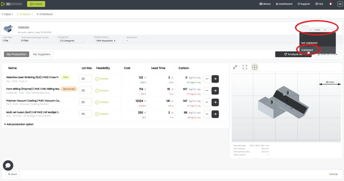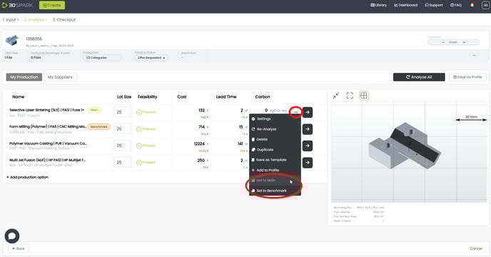 If you would like to track your cost, lead time and CO2 savings, one production option must be designated as “main” and another one as “benchmark”. You should then “validate” these cost savings once they are realized (see below).