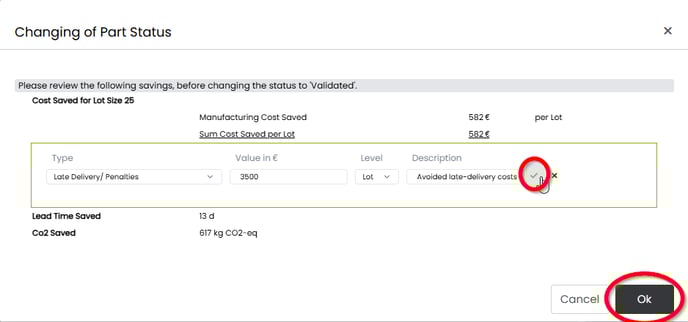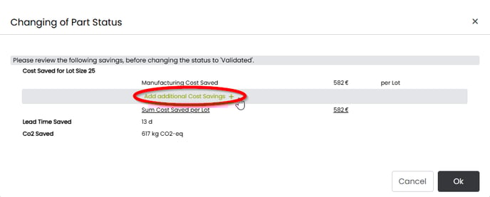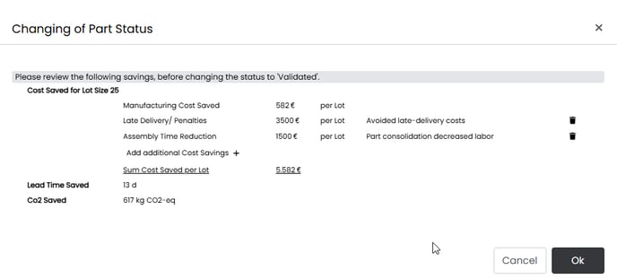 If the savings are not validated, cost and lead time savings will not be visible in the part library and they will not be taken into account in the dashboard reports.