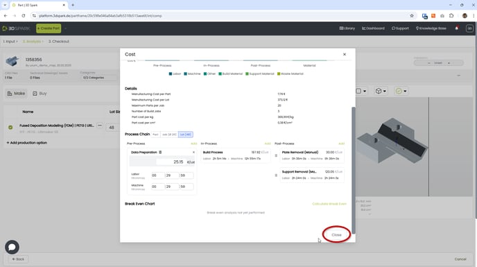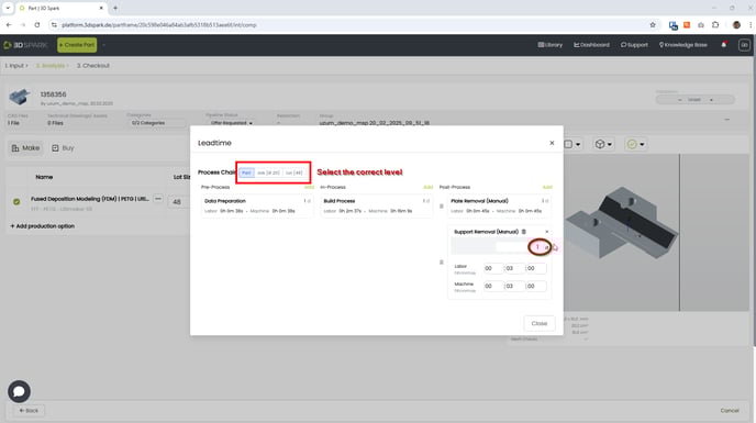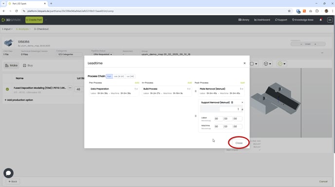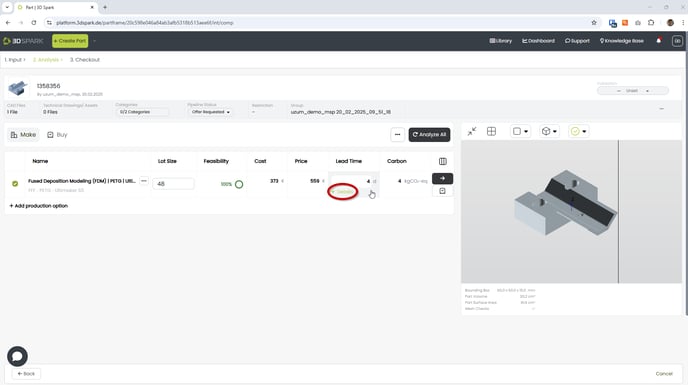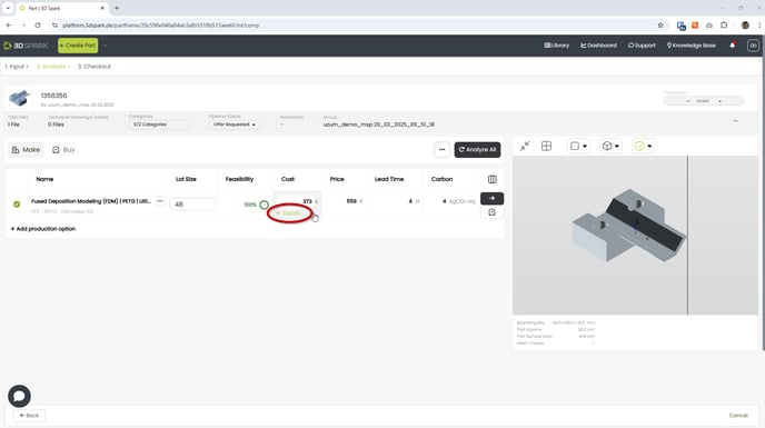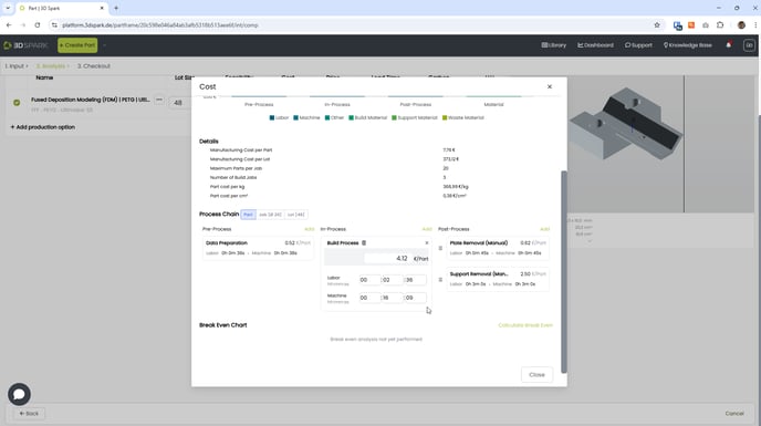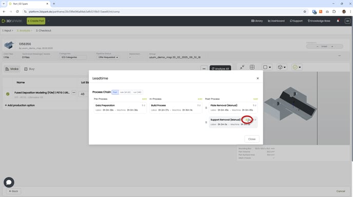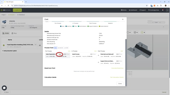 3D Spark calculates the estimated process time, cost, lead-time, and carbon footprint for each step in a production option (process chain). To enhance accuracy, you have the option to manually adjust these estimated values based on real-world observations.