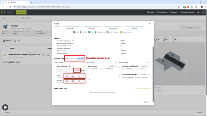 You can now manually update the cost, labor time and machine time of a process step. Please make sure that you selected the correct calculation level (per part, per job or per lot):