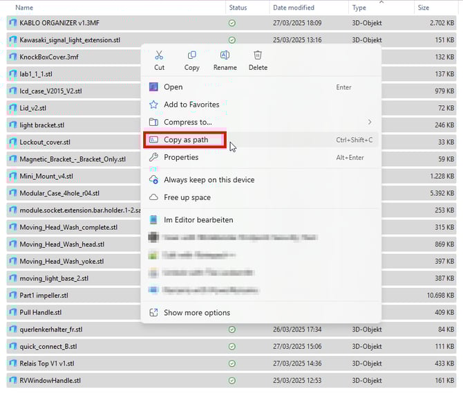 - In Windows File Explorer, select all CAD files > Right-click > Copy as path > Paste into cell A2 in metadata tab.
