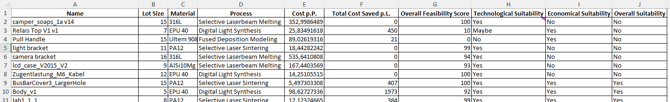 Key parameters, including material, lot size, current manufacturing technology, and pricing, are extracted for analysis. In cases where a CAD file for a part is unavailable, the ERP data can serve as a reliable alternative for evaluation. |