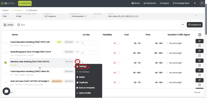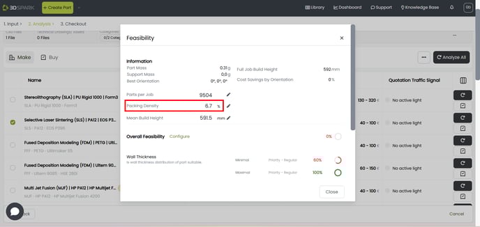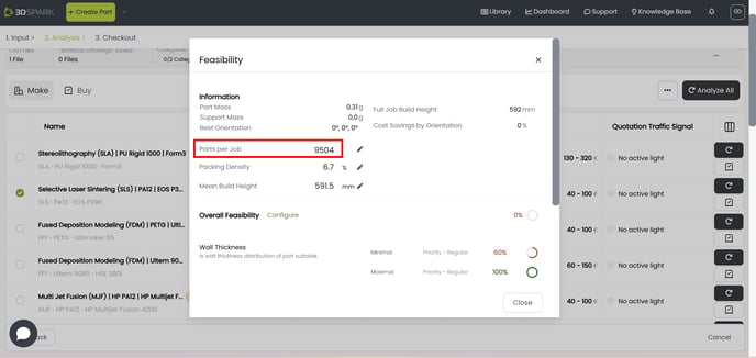 2- Within the "Feasibility" column, users can review how many parts can fit into a single build job. Adjust the maximum number of parts as necessary to achieve optimal packing density and volume utilization.