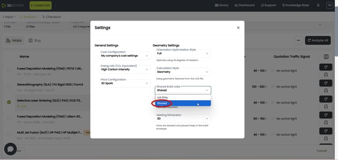 1- In the production option settings, select "Shared" under the "Shared Build Jobs" section. This option facilitates job packing by filling the available build envelope or print bed optimally with similar parts to the one currently analyzed. Consequently, production expenses are shared across multiple components, improving cost-efficiency.